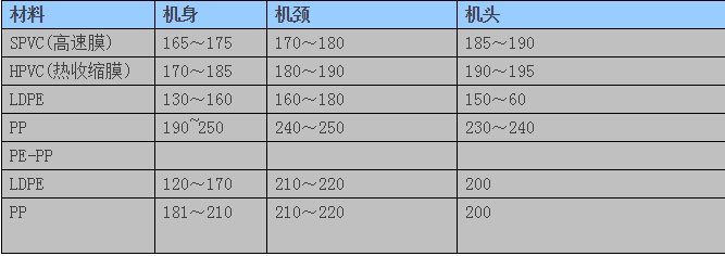 3、溫度:溫度控制是吹塑膜工藝中的關(guān)鍵,是影響質(zhì)量的重要參數(shù)。這種溫度控制方法的優(yōu)點(diǎn)是物料所經(jīng)受的高溫時(shí)間短不易分解,可減少拆卸機(jī)頭的次數(shù),提高機(jī)器生產(chǎn)的能力(見(jiàn)表1)。