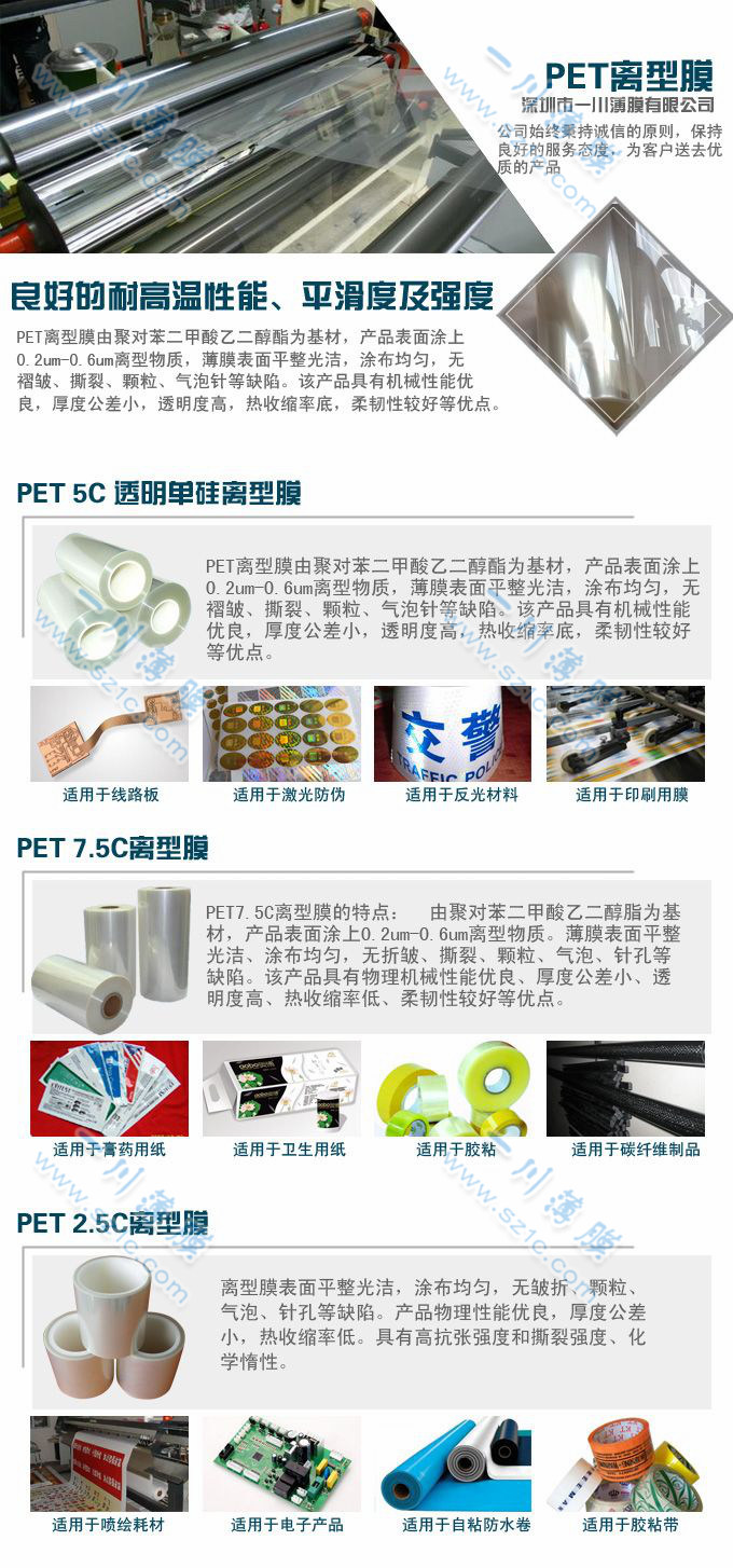 離型膜表面平整光潔,涂布均勻,無皺折、顆粒、氣泡、針孔等缺陷。產品物理性能優(yōu)良,厚度公差小,熱收縮率低。具有高抗張強度和撕裂強度、化學惰性。