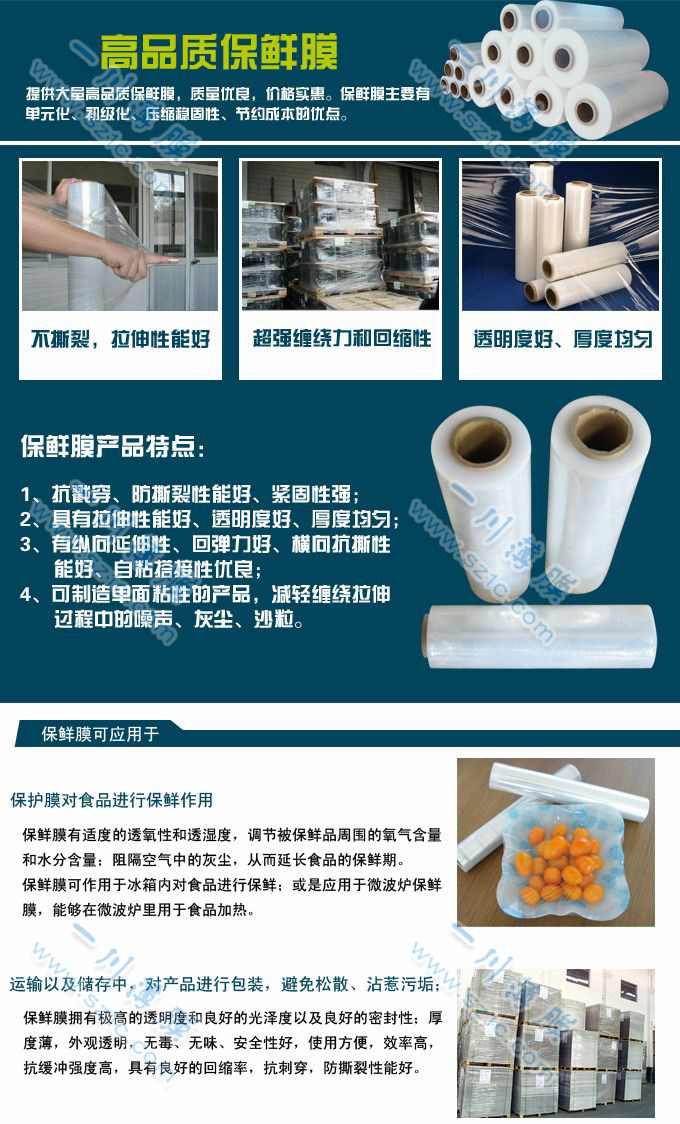 食品保鮮膜用途:用于餐廳、超市、食品包裝。如大米、蔬菜、水果、肉類、餅干?;蛑荔w中心用來做減肥瘦身用!另外可以作為防塵膜,如電腦、筆記本、運動鞋、家具、餐具等!